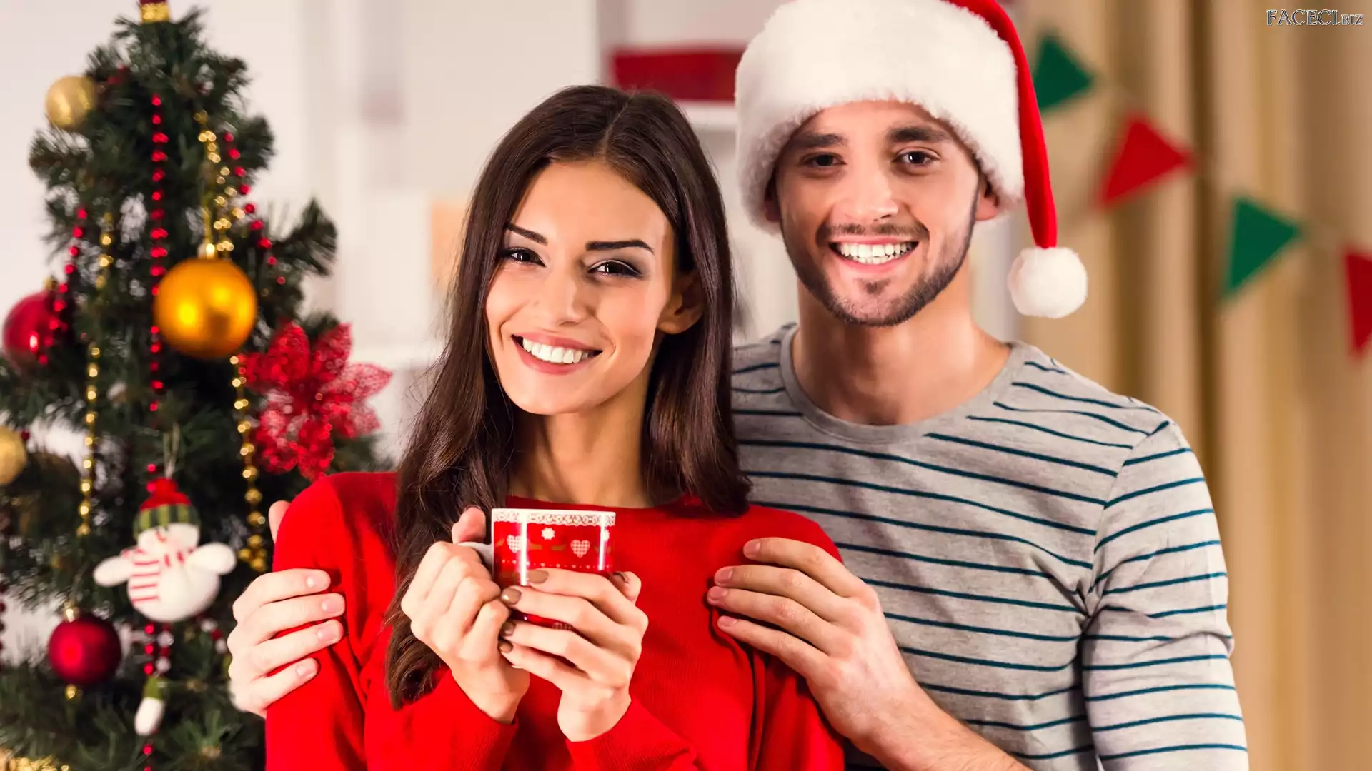Choinka, Uśmiech, Kobieta, Mikołaja, Filiżanka, Mężczyzna, Czapka - faceci.biz