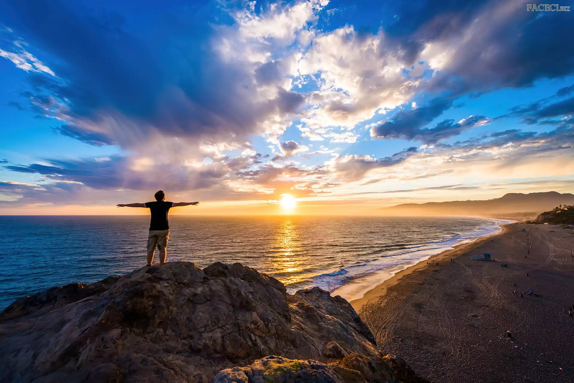 Zachód Słońca, Chmury, Morze, Mężczyzna, Skała - faceci.biz